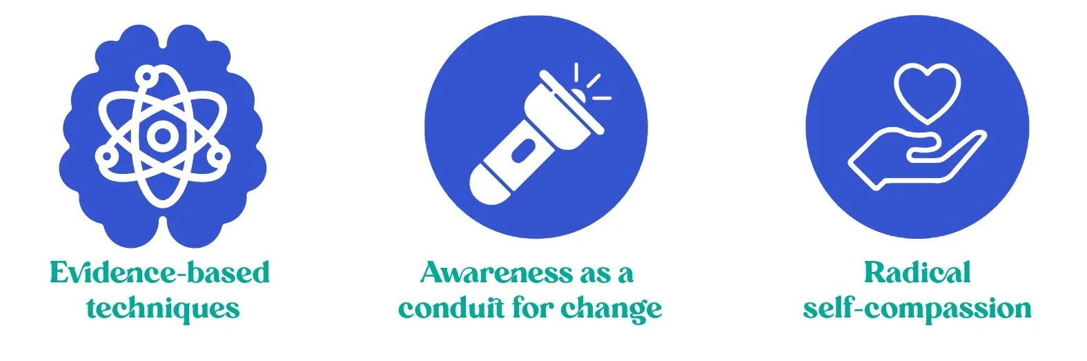 Many coaches and courses try to give you their techniques in a one-size-fits all approach. That just doesn’t work for most people, not for the long haul anyway. Every tool in this course is 100% customizable to your lifestyle, how your mind works, and your personal needs. Creating your personalized plan and getting tools to help you put it into practice everyday means that you’re set up to succeed. For those struggling to connect to themselves, there is clear instruction they can use until they can reconnect to themselves. But, at the core, everything in this course tailors to YOU!